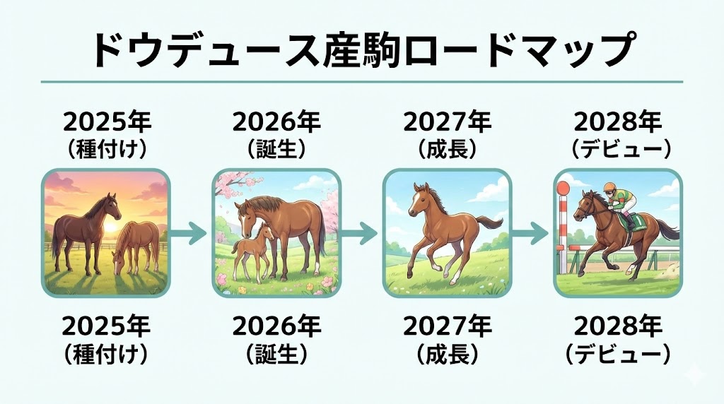 ここがポイント: ドウデュース産駒のデビューは2028年夏。2026年春の誕生から、セレクトセールを経てデビューに至るまでの約3年間、ファンは熱い期待とともにその成長を見守ることになります。