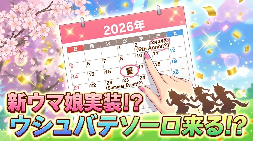 | 現在(2026年2月) | 5周年アニバーサリー | 実装の最大候補。 世界制覇を成し遂げた砂の王者の「種牡馬入り後」最初の大型イベントとして。 |